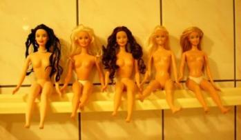 幫五個芭比娃娃,洗了個澡,坐在毛巾架上晾乾。