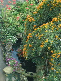 二伯家的花園裡水池旁的炮仗花正盛開著,好美喔!