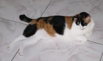 逃跑貓午睡之後,起身到客廳,躺在地上享受清涼。