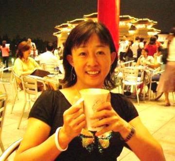 開場前,和Cheryl在音樂廳外面喝咖啡。