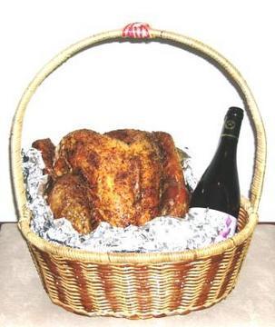 感恩節到了,飯店推出火雞大餐,也外賣烤火雞套餐,一隻烤火雞,一條法國麵包配上一瓶薄酒萊,裝在可愛的提籃裡。