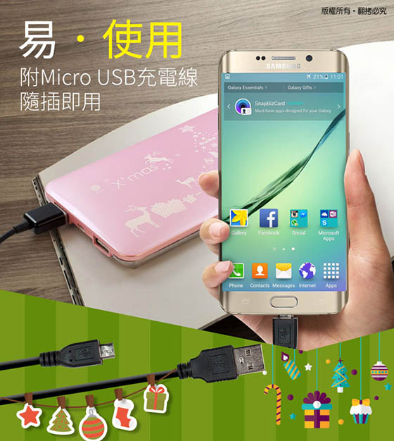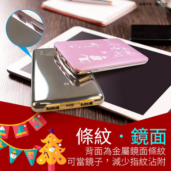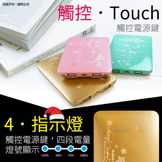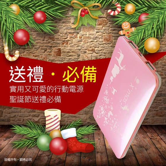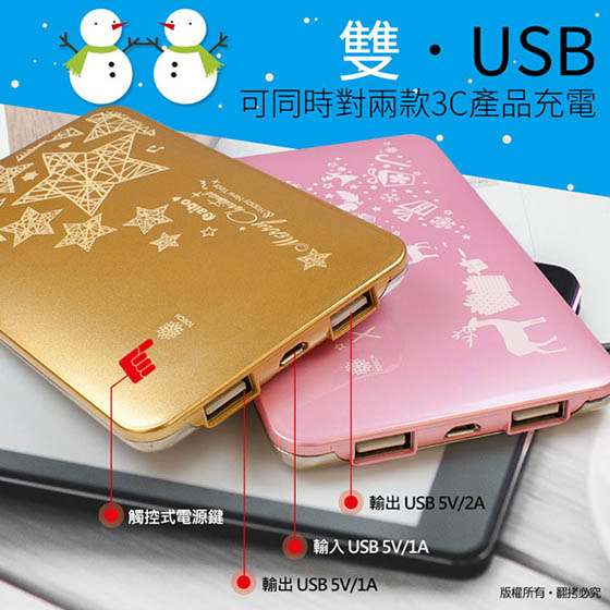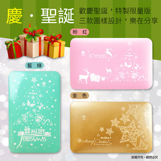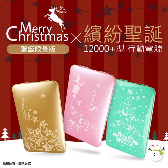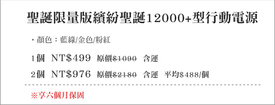 商品訊息簡述: 平均每個最低只要488元起(含運)即可購得聖誕限量版繽紛聖誕12000+型行動電源1個/2個,顏色:藍綠/金色/粉紅;享六個月保固。