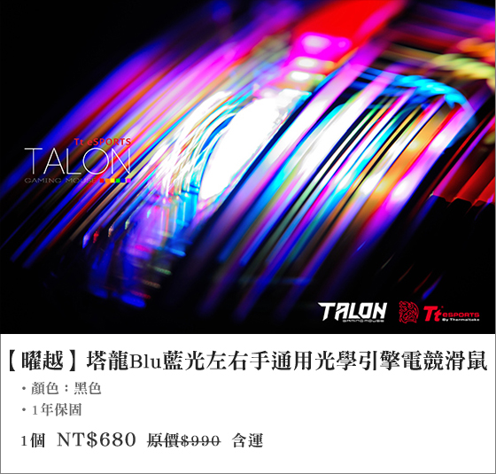 商品訊息簡述: 只要680元(含運)即可購得【曜越】原價990元塔龍Blu藍光左右手通用光學引擎電競滑鼠1個,購買即享1年原廠保固服務!
