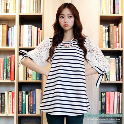 0921新品 輕閒甜味~橫條紋拼接綁帶鏤空蕾絲袖上衣?4色 的產品介紹在下面〈(__)〉