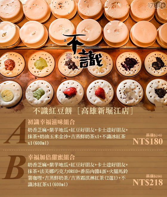 商品訊息簡述: 店取:只要180元起即可享用【不識紅豆餅《高雄新堀江店》】原價最高290元新店滿月慶方案:(A)初識幸福滋味組可刷卡合:奶香芝麻+紫芋地瓜+紅豆好朋友+卡士達好朋友+抹茶+奶油玉米金沙+吉蒸鮮奶茶x1/(B)幸福加倍甜蜜組合:奶香芝麻+紫芋地瓜+紅豆好朋友+卡士達好朋友+抹茶+法芙娜巧克力OREO+番茄肉醬&蛋+火腿馬鈴薯咖哩+吉蒸鮮奶茶/吉蒸霜淇淋紅茶(2選1),以上A、B方案皆含:不識冰紅茶x1(600ml)。