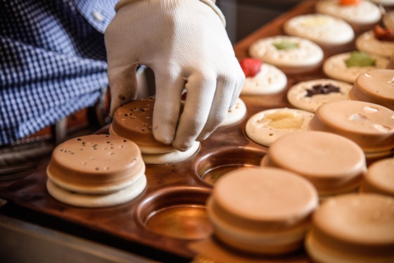 爐上一個個熱騰騰的紅豆餅,特別精選和果子專用的水手牌超級蛋糕粉,捨棄傳統泡打粉,純以新鮮蛋白打發,紮實的質地、濃郁的蛋香,每個紅豆餅平均要烘烤20分鐘,職人堅持成就非凡美味。