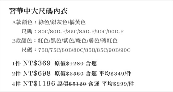商品訊息簡述: 平均每件最低只要299元起(含運)即可享有奢華中大尺碼內衣1件/2件/4件,款式、顏色、尺碼任選。