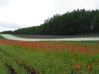 在富良野自然公園裡,舉目所見,除了花,還是花,真是美不勝收!而前往富良野途中,行經美瑛丘陵,雖然它並非觀光公園,但是依然有其特色,怎麼說呢?美瑛丘陵擁有「拼布大地」的別稱。什麼是拼布大地呢?在台灣,農田的景象大凡是很單調的,只有油麻菜籽田是別具風味,其他的,便沒有什麼好說,但是再美瑛丘陵,大地上所種植的不只一種農作物,有鮮黃的麥田、綠油油的甜菜田、綴有小白花的馬鈴薯田以及艷黃的向日葵田,縱橫交錯,將大地妝點的彷若拼布一般美景,這是在台灣所看不見的美景,那樣單純和諧,讓人難以忘懷….可惜司機表示不能路中臨時停車,也就無法攝影留念了,只好讓美景慢慢的浸漬入骨吧!