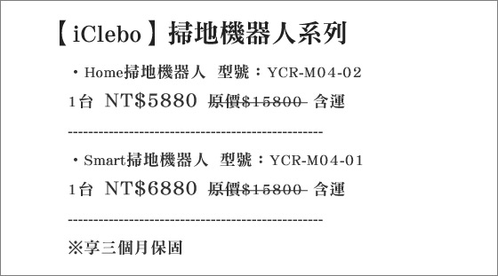 商品訊息簡述: 只要5880元起(含運)即可購得【iClebo】原價15800元掃地機器人瘦身男女pps系列1台:(A)Home掃地機器人(YCR-M04-02)/(B)Smart掃地機器人(YCR-M04-01),享三個月保固。