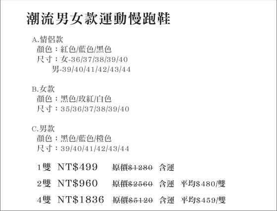 商品訊息簡述: 平均每雙最低只要459元起(含運)即可購得潮流男女款運動慢跑鞋1雙/2雙/4雙,多款多尺寸可選。