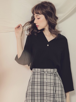 【購買限時優惠】半開襟壓褶綴珍珠雪紡寬袖上衣 本季限量優惠