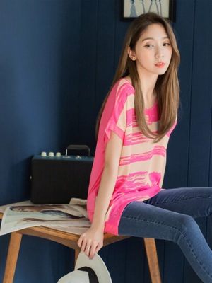 今天找到這樣商品斑駁撞色條紋涼感圓領上衣.2色覺得還不錯