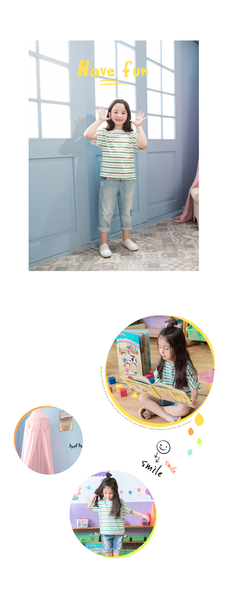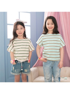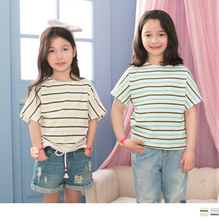 【便宜團購】條紋不修邊落肩圓領短袖上衣-童2色 周年慶活動購物優惠