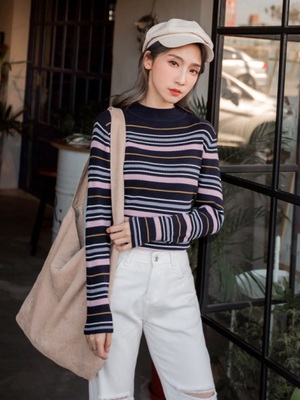 今天找到這樣商品配色橫條紋高領合身針織上衣覺得還不錯