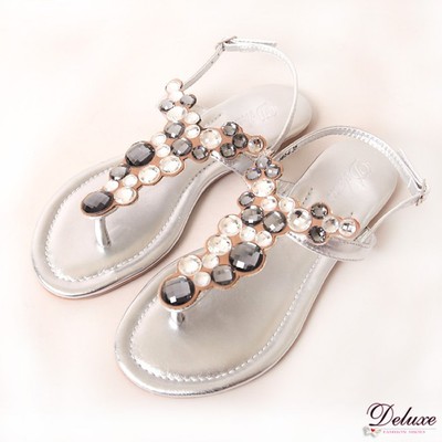 你一定要來看看【☆Deluxe☆】微風夏日-清涼微露Y字黑白圓水晶夾腳涼鞋(★銀)~~