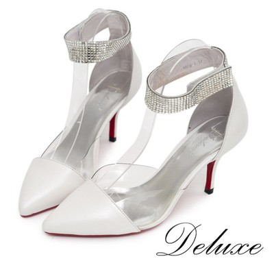 【Deluxe】全真皮尖頭高跟鞋(典雅繞踝水晶-白色)