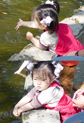 玩畢丟石頭的遊戲後,又帶嘟到此餵魚。 嘟很大方ㄡ,把她自己的三明治早餐和海苔米果全都拿出來貢獻給魚兒, 本來還要把她的Juice請魚兒喝的, 麻咪說〔不用啦 Fish在水裡已經喝好多水囉 喝不下...