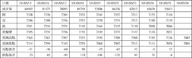 高低點震盪預測+/-誤差大於75點或與前日變化大表示進入盤整或新趨勢