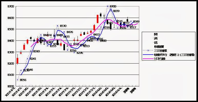 藍色實線為指標的移動平均線(週期2)