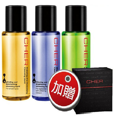 - 商品組合:CHER 不流淚潔顏液3入組(水QQ+白CC+青靓靓) 加贈 CHER純棉化粧棉(限量39組)