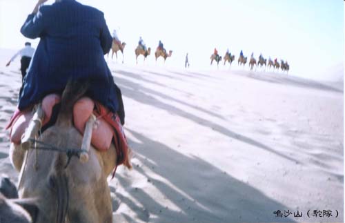 在鳴沙山那裡,他們把阿毛們串成一串,因為阿毛很乖,會乖乖跟著前面的人走,所以走起來就是長長的一隊,我就在整個駝隊的最後方,有最好的取景位置,怎麼樣?看起來是不是很浪漫啊?