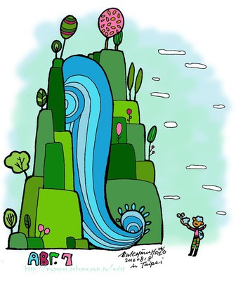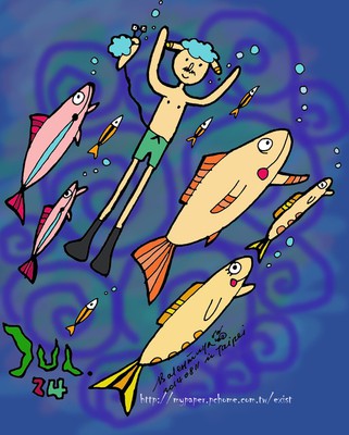 2014drawings-058Swimming all day long in the silence world.某日,散步至山區瀑布旁的小舖,突然聽見久違的歌聲,張雨生的〈一天到晚游泳的魚〉,這...