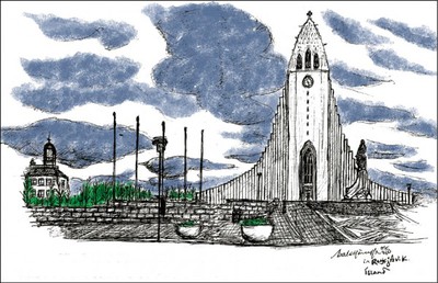 白日坐在市政廳旁的托寧湖(Tjornin Lake)湖畔畫圖,成群的海鷗、雁鴨各具姿態。再散步到有著潔白柱狀玄武岩造形、高73公尺的哈爾格林姆教堂(Hallgrimskirkja),陽光穿進簡約的教堂,坐在木椅上享受異常的靜謐氛圍,偶爾進來的觀光客拍照聲都嫌嘈雜,一位老先生坐在有5275根風管的風琴前開始彈奏,旅途中總有這樣意外的驚喜。