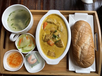 淑嘉和好久不見的Mars,我們三個人一起吃飯。這次的餐廳是淑嘉找的西貢餐廳,生意非常好,中午到快三點都還是滿滿的用餐客人,幸好我們有先訂位。門口還停著可愛的宣傳腳踏車。經典越式套餐,一份就可以吃的很飽...