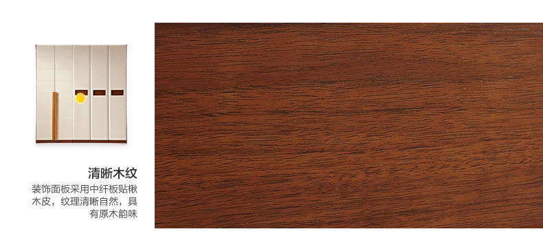 2.[-優質板材-]:裝飾面板采用中纖板貼深胡桃色楸木皮工藝,表面平整光滑,不易開裂,紋理清晰自然,具有原木韻味;
