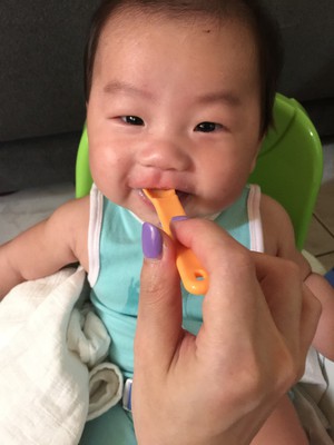 愷愷默默地又6個月了!!!! ^_^ 依舊是吃貨一枚, 雖然奶量沒有增加仍是每餐180cc,但多會加一匙米精增加飽足感, (所以將近是200cc囉) 副食品接受度也都很高: 稀飯(都不用打成泥...