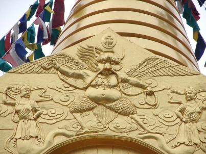 因此,佛法中的普巴金剛、大威德、時輪金剛、忿怒蓮師、馬頭明王、八大嘿嚕嘎等,祂們頭頂上火焰中都有一隻【大鵬金翅鳥】(Khyung),用以度化龍族及鬼魅、邪神。