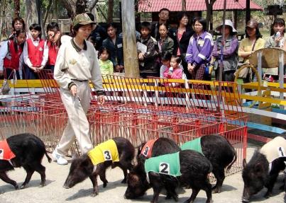 徐崇雄董事長表示,豬向來被人們視為﹁愚蠢﹂、﹁懶惰﹂的代名詞,該動物園馴獸師仿傚訓練狗的方式,經過一番努力,將十多頭相當難馴服,來自蘭嶼的迷彩豬訓練得服服貼貼,變成為﹁驍勇善戰﹂、﹁穿山涉水﹂,順利成功闖關的﹁運動健將﹂,騁馳於障礙賽,並逐一排除障礙,過關斬將,令參觀過的遊客不得不刮目相看﹗