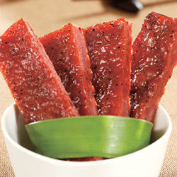 【特厚黑胡椒豬肉乾】 精選黑胡椒粗粒揉合在肉乾裡,使用40年改良研發的傳統獨家配方醃製,堅持古早口味與製程,吃起來爽口且透露著微微碳烤與黑胡椒香氣。