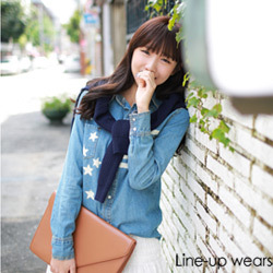 【韓國 Line up-Lady】率性感個性口袋點綴鉚釘 星星條紋牛仔丹寧長袖襯衫 ★人氣單品★