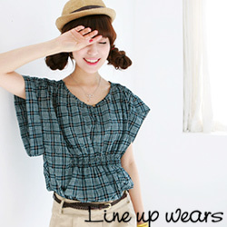 【韓國 Line up】時尚造型~蝴蝶袖剪裁俏麗短版格紋衫