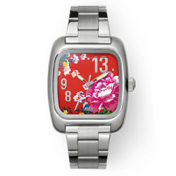 REX Colouring系列-Silver-休閒腕錶-紅牡丹 Colouring系列:此款手錶以獨特的大錶面與千變萬化做為設計重點,並將日常生活中的事物元素融入其中, 設計成一系列圖樣豐富且變化多端的方型個性錶款。