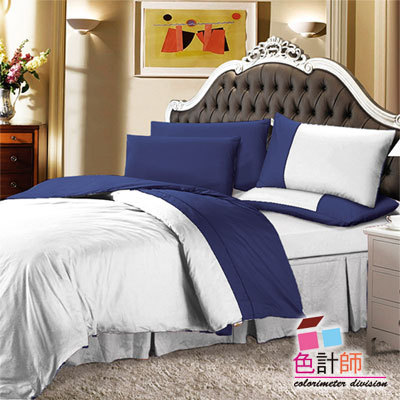 色計師【純潔白+時尚藍】加大3件式精梳棉床包組