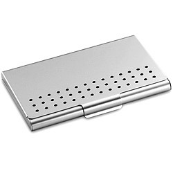 | 《REFLECTS》超輕橫點名片盒 此款名片盒外型簡約俐落,金屬霧面銀鋁質,超輕薄只有17 g、厚度也只有 0.8 cm,您可輕巧的放於襯衫口袋,絕不造成負擔。以簡易的扣闔方式收納,橫式開啟,盒面有簡約的橫式圓點構圖,簡易中增添豐富度,呈現出歐洲經典的簡約美學。