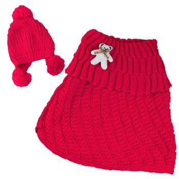 小熊配飾翻領毛線造型披肩帽+斗篷圍巾 - 紅色