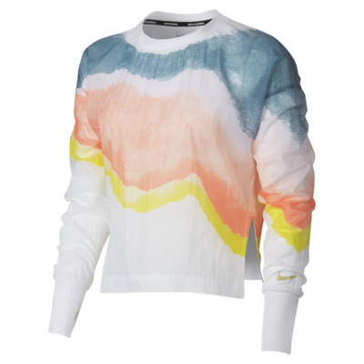 Nike Repel 女款跑步外套採用輕盈抗水材質,舒適包覆無煩惱。水彩風格印花結合短版套頭設計,成就寒冷季節的時尚必備單品。