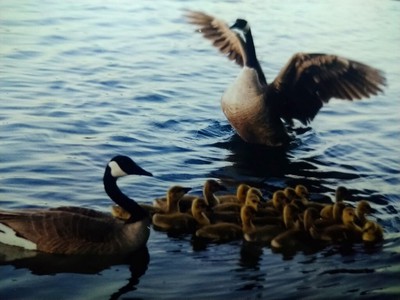 張翼護雛者即為銅牌獎作品,另一張則為雁家族浩浩蕩蕩下水的場面。