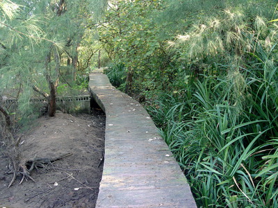 這天我們的散步路線是先走一小段南向的61公路之後右轉,過一條景觀非常漂亮也是我非常喜歡的水泥橋(橋下水岸有隻紅臉大白鴨,無法確定是野鴨還是人家籠裡逃出來的流浪鴨),順著海堤往南走,此時正漲潮,海浪雖大,水色澄藍,也蠻動人的,海岸既然不好玩,便回頭下橋順著新屋溪一路逛往出海口,此處難得防風林茂密如覆,裡頭築有幽靜的步道可供穿梭通行,穿過招潮蟹橫行的防風林步道,來到了北岸,這兒新增許多戶外健身設備,夠玩的了。