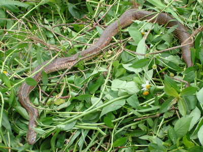 突然,在拔起一大撮時,發現了草叢下,離我手起之處才半尺距離之處,一團花紋斑爛之物。哇!一下蹦出三尺遠,驚聲尖叫只怕聲傳不止十里,媽呀,蛇!蛇啦!