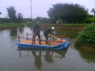 陳先生覺得,小筏應該是用撐的,不是用划的,二話不說,回到他的竹林,劈拍兩下幹回一枝大竹杆來,於是我們一下子又解決了杆子的問題,早先沒有槳時,用的是一根澆水瓢的木柄,太短了,一點都不好用,以後有好用的東西了。