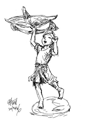 這個小男孩手上舉著一個風箏,與他的身形相比,風箏有如龐然大物,小男孩身體略朝後仰,看來正準備把風箏放了,小男孩的臉上表情豐富,笑得開心,彷彿還可以聽見他朝著遠處為他拉線的玩伴吆喝著:準備跑啊,我要放囉!