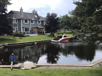 後門除了是庭園,臨水處還設有碼頭,用以棲舶自己的船。遊艇、釣魚船、水上摩托車、一上船也是立即可以銜接上星羅棋佈的密麻麻水道及湖泊,乘船可以逛遍整座社區,也可以沿著水道進入一座一望無際的大湖,再更遠些甚至可以連結北美五大湖,玩幾天、幾個月都玩不完。