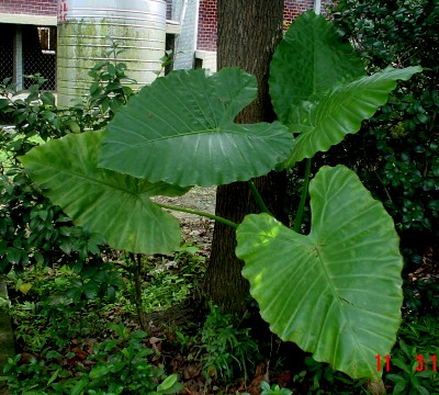 姑婆芋在台灣低海拔山區到處可見,成枝長得翠綠婷婷生機盎然。要是生長在陽光下,加上水分充足,它的生長更誇張得綠油油的。大約在卅、四十年代,它的葉子可是攤商最好的包裝紙,包魚包肉包豆腐無所不包,可說是當時的包裝明星哩。它的汁液帶毒性,沾到人體皮膚癢得一塌糊塗。窮家小孩不怕癢,將它的葉子割下一疊疊送去市場叫賣,日子雖然難過,但有這筆收入對家庭用度不無小補。