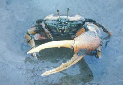 有一種被稱為「厚蟹」的蟹類,每於退潮之時,成群結隊大搖大擺的在蘆竹跟下竄走。一付旁若無人的樣相,讓人看了都覺得好笑。根據一位對牠熟悉的朋友說:這種厚蟹生性殘忍,牠是屬於食肉蟹族,左鄰右舍常在不知不覺裏,變成為牠們的食物。即便是蟹殼堅硬的大眼蟹,一不小心就會成為牠們的口糧。
