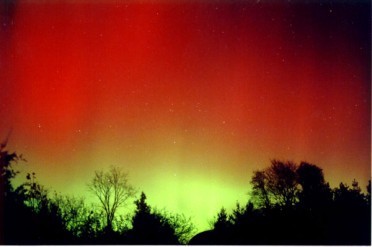 說著說著,我自車子前面之擋風玻璃看出去,滿眼所見,都是綠、紅、黃之光線閃動交織著,就像戰爭時期夜間的探照燈一樣,將天空照耀得五彩繽紛。這次我很努力的觀賞,覺得它的變化雖很簡單,但那滿腦子的色彩光線,卻是讓我印象深烙不滅。