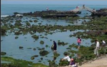 水退石露,海草留綠,海礁露石顆顆依偎連綿一片,給人依中悠黑暗率之感覺。潮間帶是海神賜給人類的糧倉,潮來潮往孕育無數的糧食,取之不完用之不絕。每每潮退之時,岩縫水漥留下豐富的海產。螺貝魚蝦、章魚螃蟹、四散躲著等候人們前來捕捉。